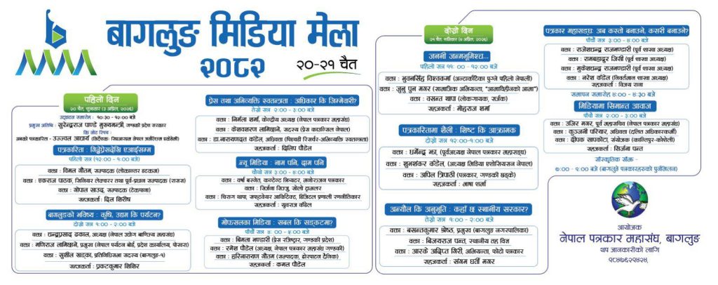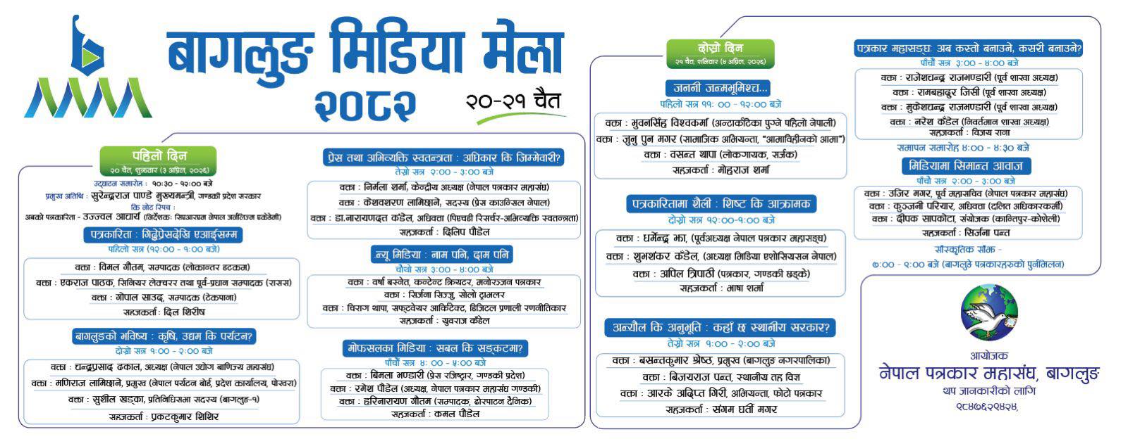 बागलुङ , १९ चैत्र । बागलुङमा हुन लागेको बागलुङ मिडिया मेलाको तयारी पूरा भएका छ । भोलि शुक्रबारदेखि हुने लागेको मेलाको उद्धाटन गण्डकी प्रदेशका मुख्यमन्त्री सुरेन्द्रराज पाण्डेबाट आउनुहुने भएको छ...