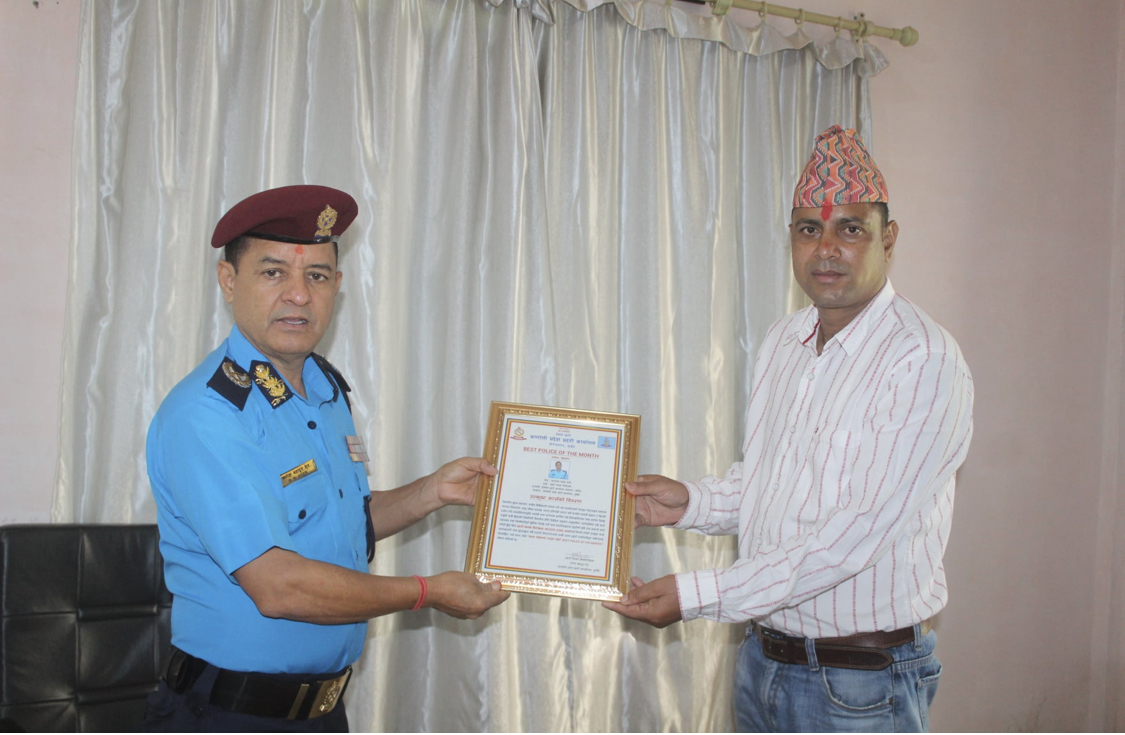 नेपाल प्रहरीको विभागीय मूल्य–मान्यता, आदेश–निर्देशनको पालना गरी व्यावसायिक, लगनशील भएर कर्तव्य निर्वाह गरेकाले उनलाई साउन महिनाको सर्वोत्कृष्ट प्रहरी घोषित गरेको प्रदेश प्रहरी कार्यालयले जनाएको छ ।