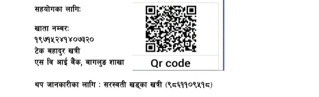 सहयोगको याचना गर्दै खत्रीले आफ्नो श्रीमानको उपचारकालागि एस वि आई बैक बागलुङकाे १९७१५२४१४०७३२० खाता नम्बरमा सहयोग गरिदिनुहुन अपिल गर्नुभयो ।