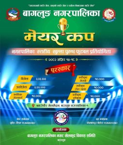 बागलुङ, १९ कात्तिक । बागलुङमा मेयरकप हुने भएको छ । नगर खेलकुद विकास समितिको आयोजनामा आगामी मङ्सिर १४ देखि १८ गतेसम्म खुला पुरुष फुटबल प्रतियोगिता हुने भएको हो ।