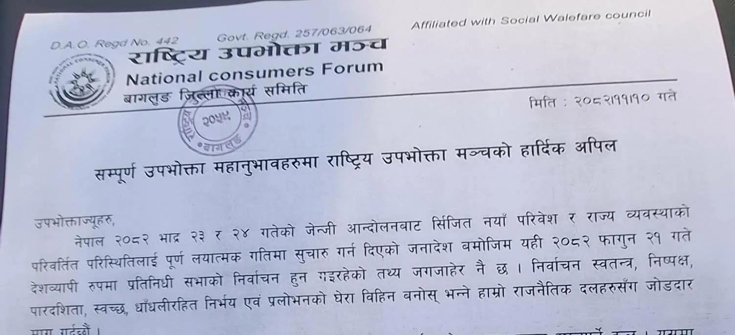 मञ्चले एक विज्ञप्ती जारी गर्दै निर्वाचनलाई भयरहित र शान्त वातावरणमा सम्पन्न गर्न सरोकारवालालाई अनुरोध गरेको छ । डिजिटल युगमा मतदाताले कसलाई मतदान गर्ने भन्ने आफैले निधो गरिसकेका हुने भएकाले अस्वभाविक तरिकाले मत प्रभावित नगर्न र निर्वाचनको वातावरण शान्त राख्न अनुरोध गरिएको श्रेष्ठले बताए ।