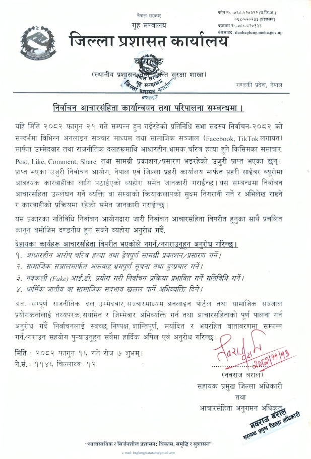 आधारहीन आरोप चरित्र हत्या तथा द्वेषपूर्ण सामग्री प्रकाशन÷ प्रसारण गर्ने ,.सामाजिक सञ्जालमार्फत अफवाह भ्रमपूर्ण सूचना तथा दुष्प्रचार गर्ने, नक्कली (फेक) आई.डी. प्रयोग गरी निर्वाचन प्रक्रिया प्रभावित गर्ने गतिविधि नगर्ने धार्मिक जातीय वा सामाजिक सद्भाव खलल पार्ने अभिव्यक्ति दिने ।अतः सम्पूर्ण राजनीतिक दल, उम्मेदवार, सञ्चारमाध्यम, अनलाइन पोर्टल तथा सामाजिक सञ्जालप्रयोगकर्तालाई तथ्यपरक संयमित र जिम्मेवार अभिव्यक्ति गर्न तथा आचारसंहिताको पूर्ण पालना गर्न,अनुरोध गर्दै निर्वाचनलाई स्वच्छ, निष्पक्ष, शान्तिपूर्ण, मर्यादित र भयरहित वातावरणमा सम्पन्न गर्न ÷गराउन सहयोग पुयाउनुहुन जिल्ला प््राशाशन कार्यालय बागलुङले हार्दिक अपिल गरेकाो छ ।